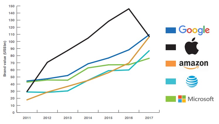 En base a estos criterios, Google se sitúa como número uno en valor económico sobre todo por sus sólidos beneficios por publicidad. Tras ella se ubicaron Apple, Amazon, AT&T, Microsoft, Samsung, Verizon, Walmart, Facebook e ICBC.
